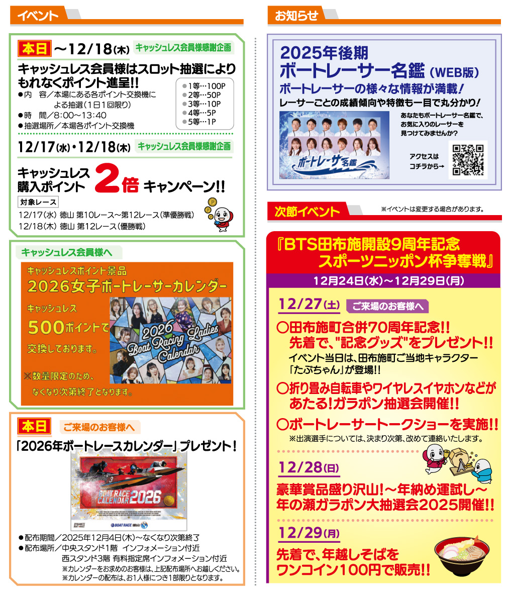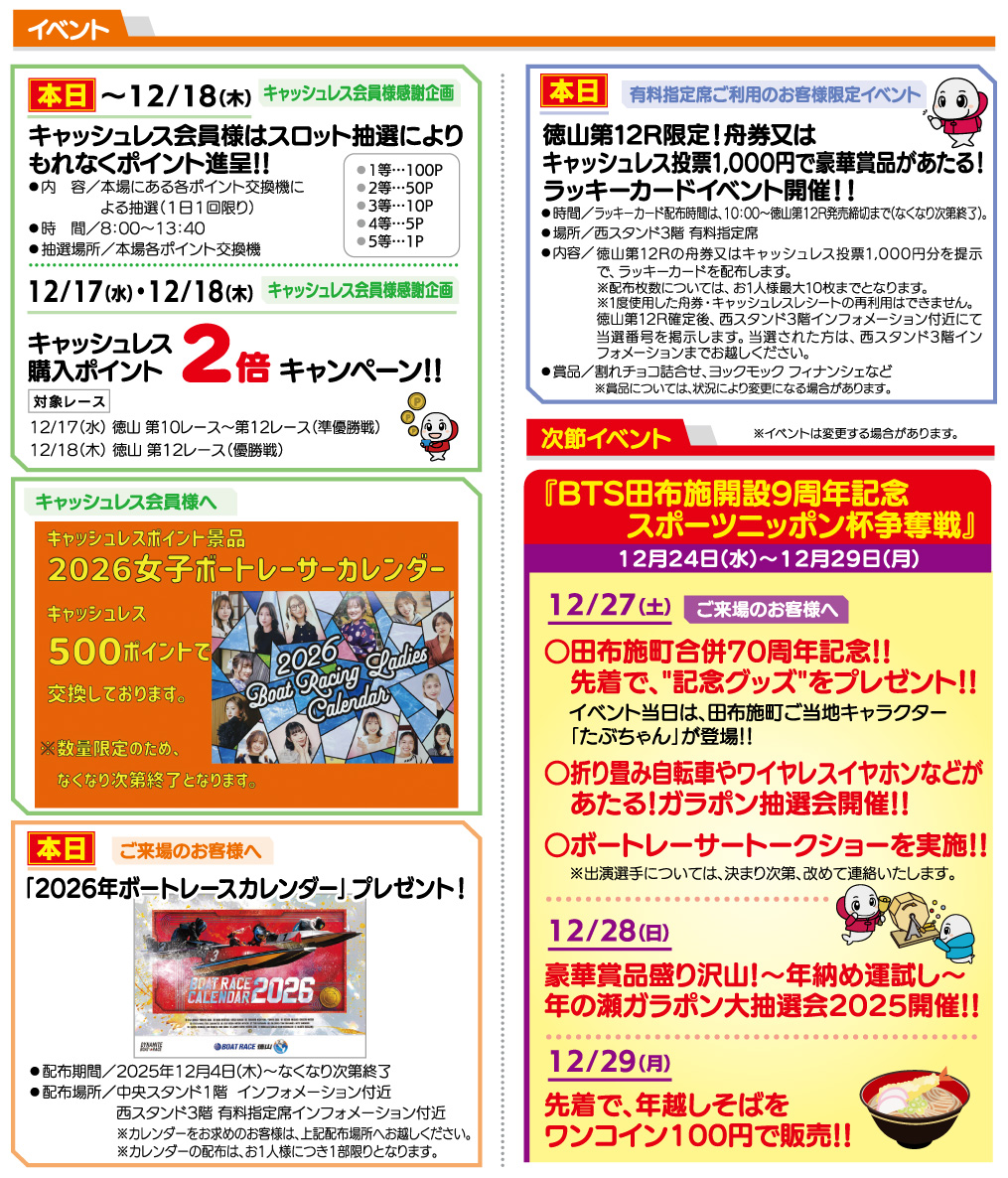 徳山開催レース3,000円以上の未確定舟券もしくはキャッシュレスレシート1枚につき1回参加可能。(※)