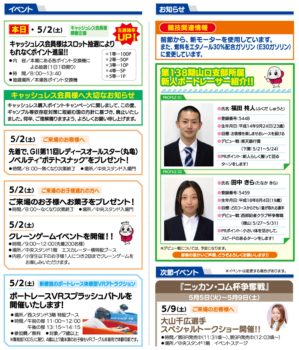 2026/04/27 キャッシュレス購入ポイントキャンペーンに関する大切なお知らせ 日頃より、ボートレース徳山をご愛顧いただき、誠にありがとうございます。 昨年度まで実施していたキャッシュレス購入ポイントキャンペーンに関しまして、この度、ギャンブル等依存症対策に取組む国の方針に基づき、廃止いたしました。 何卒、ご理解賜りますよう、よろしくお願い申し上げます。