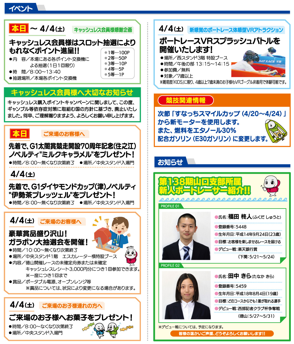 2026/03/25 重要 キャッシュレス購入ポイントキャンペーンに関する大切なお知らせ 日頃より、ボートレース徳山をご愛顧いただき、誠にありがとうございます。 現在実施しておりますキャッシュレス購入ポイントキャンペーンに関しまして、 この度、ギャンブル等依存症対策に取組む国の方針に基づき、次節(3/30~)以降、 廃止いたします。 何卒、ご理解賜りますよう、よろしくお願い申し上げます。