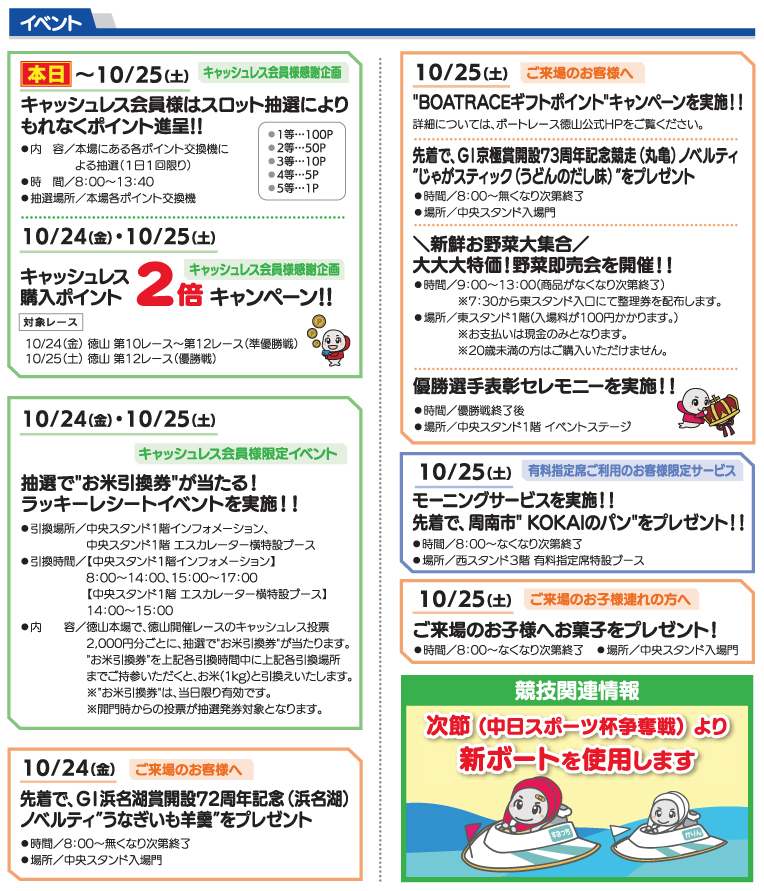 徳山本場で、徳山開催レースのキャッシュレス投票2,000円分ごとに、抽選で"お米引換券"が当たります。