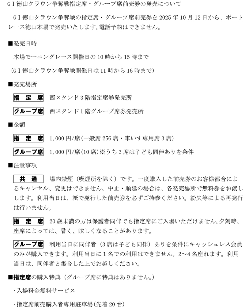 GⅠ徳山クラウン争奪戦指定席・グループ席前売券の発売について