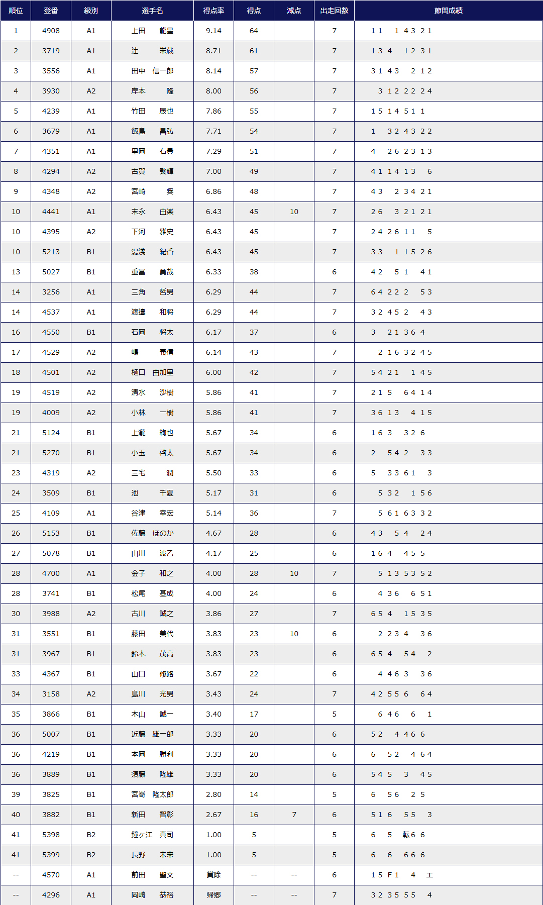 にっぽん未来プロジェクトin徳山 予選最終日までの得点率ランキング