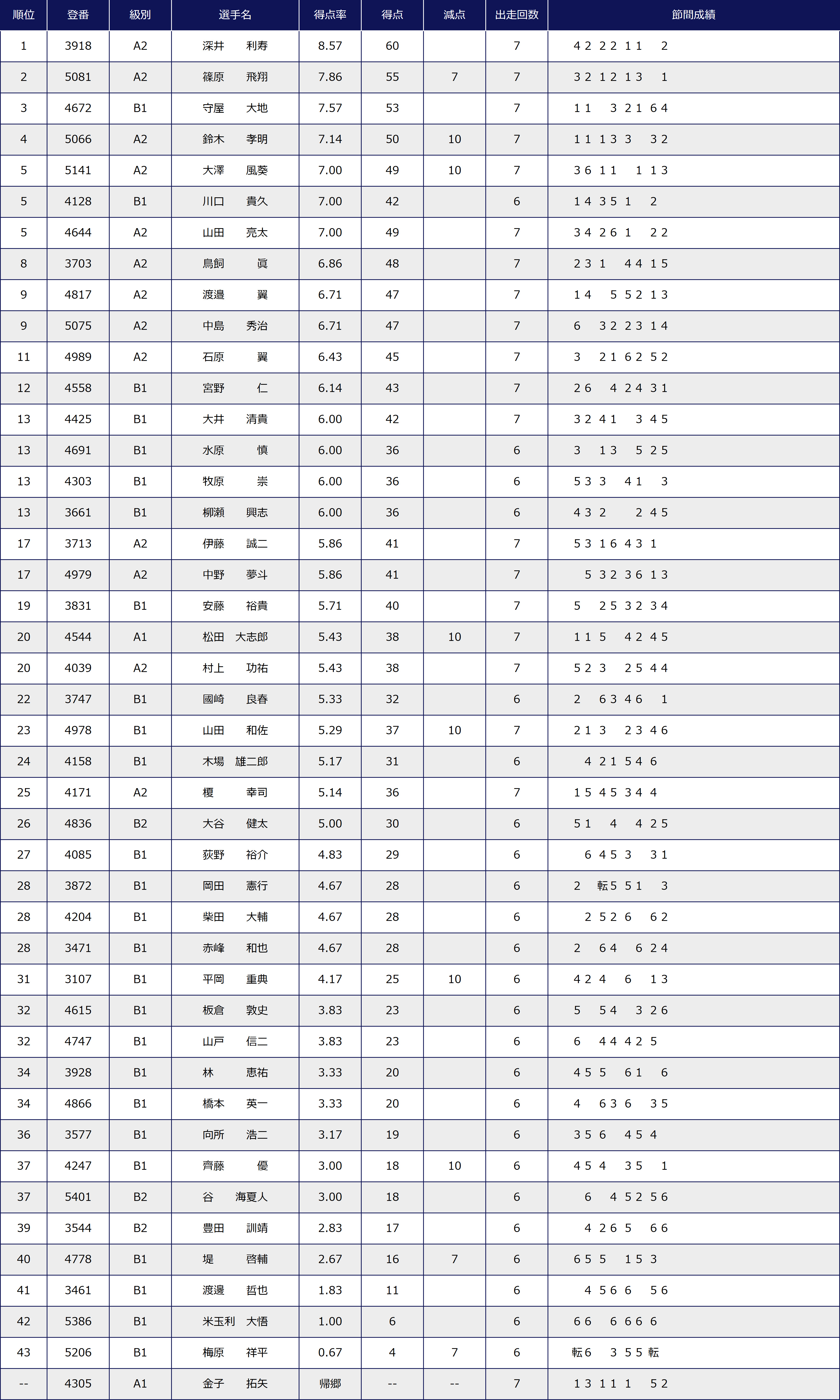 予選最終日までの得点率ランキングとなります。
